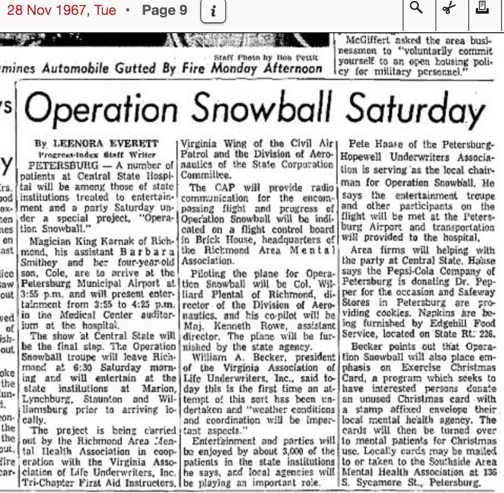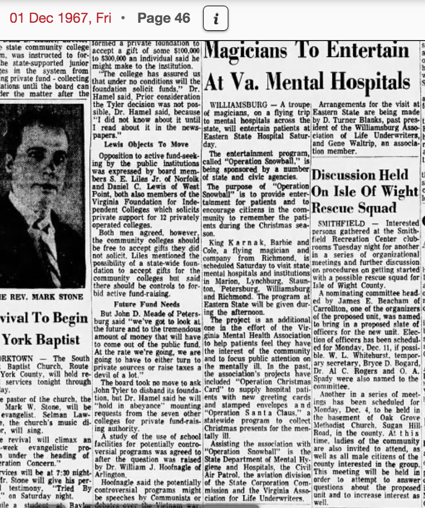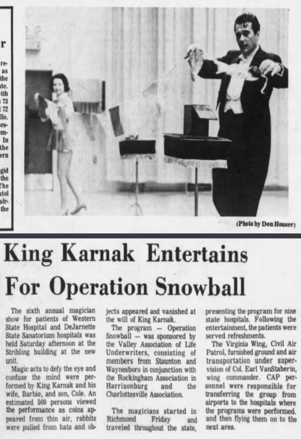 Under the auspices of Operation Snowball, “King Karnak, Barbie, and Cole” would become a ten-year annual touring magic show across the state of Virginia. The purpose of the act was to provide Christmastime entertainment for the patients at all, or most, of the mental institutions in Virginia; there were a lot mental hospitals in those days. Western State Hospital in Staunton, Virginia was on the list.