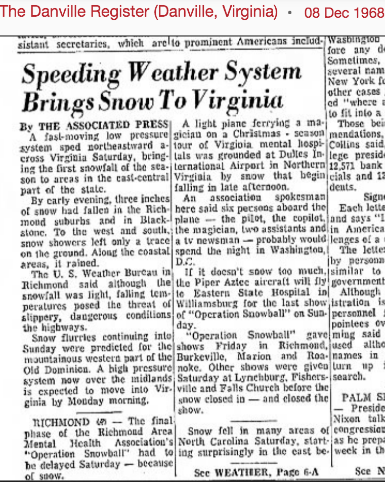 I’ve since gone down to Richmond looking through Public Library microfiche files of the Richmond News Leader and Times Dispatch (both newspapers I delivered as a paperboy in my neighborhood from 11 to 14) for articles or photos from the Operation Snowball years (1967 to 1976), but I couldn’t find anything.