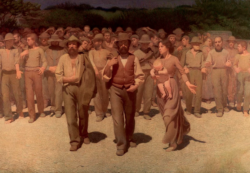 Giuseppe Pellizza da Volpedo's famous oil painting "Il Quarto Stato," ("The Fourth Estate" – 1901), representing Italy's progressive movement, announces "1900's" ripe climate of social struggle as a background for the opening credit sequence. A lush Ennio Morricone horn motif plays as the camera pulls back slowly from the squinting eyes of a bearded peasant who breaks the painting's fourth wall, staring directly at the viewer while surrounded by his drably dressed kith and kin. A sad-eyed woman, most likely the man's wife, walks behind the headstrong leader of the socialist group, holding a baby boy, with her free hand outstretched in a pleading gesture. Her troubled physicality is reflected in the many tens of oppressed farm workers that follow their self-assured leader marching them toward inevitable conflict.