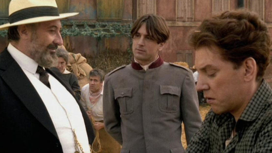 Broken into four periods to reflect the passing seasons, and split into two acts by an intermission, the story picks up in 1901, forty-four years before Liberation Day. A drunken hunchbacked jester (ala Verdi's "Rigoletto") breaks the silence of dawn with a tearful announcement of composer Giuseppe Verdi's death. Rigoletto's archetypal voice of exposition establishes an operatic theatricality that bookends the picture. Symphonic music swells over night's lingering blue light in 1901 when the peasant bastard Olmo Dalco, and Alfredo Berlinghieri, the landowner's heir, are both born. Olmo slips from the womb before Alfredo, causing sincere consternation in Bert Lancaster's uber Padroné, Alfredo Berlinghieri Sr. who complains vociferously.