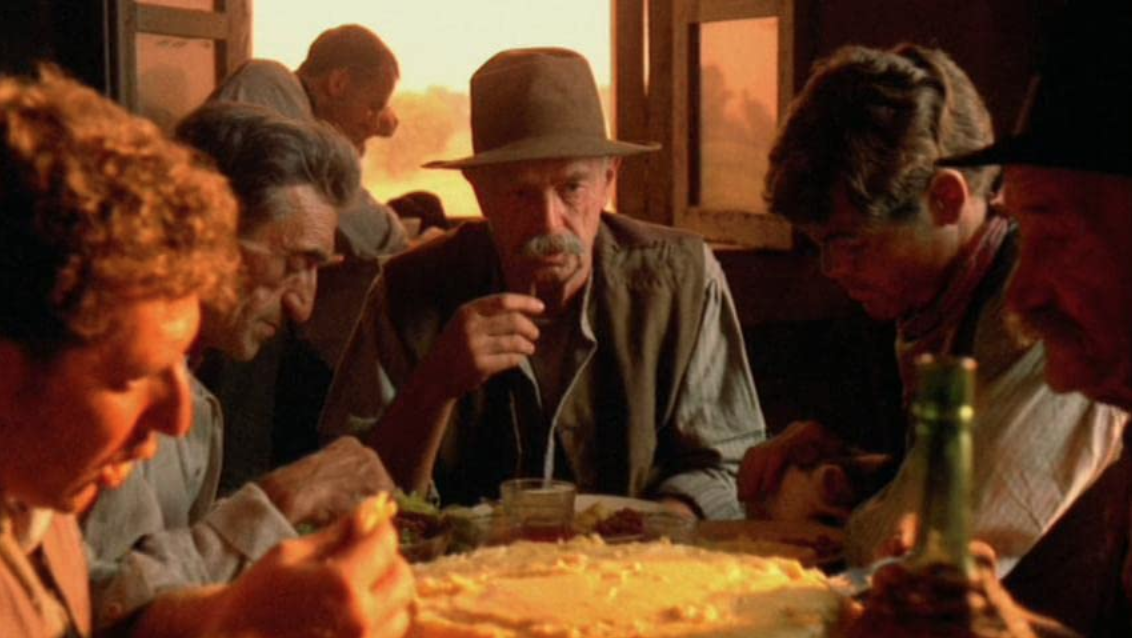 Paradoxically, a girl cries inconsolably because the seminary wants to take Olmo away to the priesthood. Olmo's grandfather Leo Dalco (Sterling Hayden) publicly strikes down the idea and silences a heckler who calls Olmo a "bastard" at the peasants' nightly communal sunset dinner. Hayden's imposing patriarch quells the verbal abuse and seizes the moment to ceremoniously indoctrinate Olmo into manhood with a directive speech that fulfills Bertolucci's thick narrative tapestry of theme, character, and plot lines.