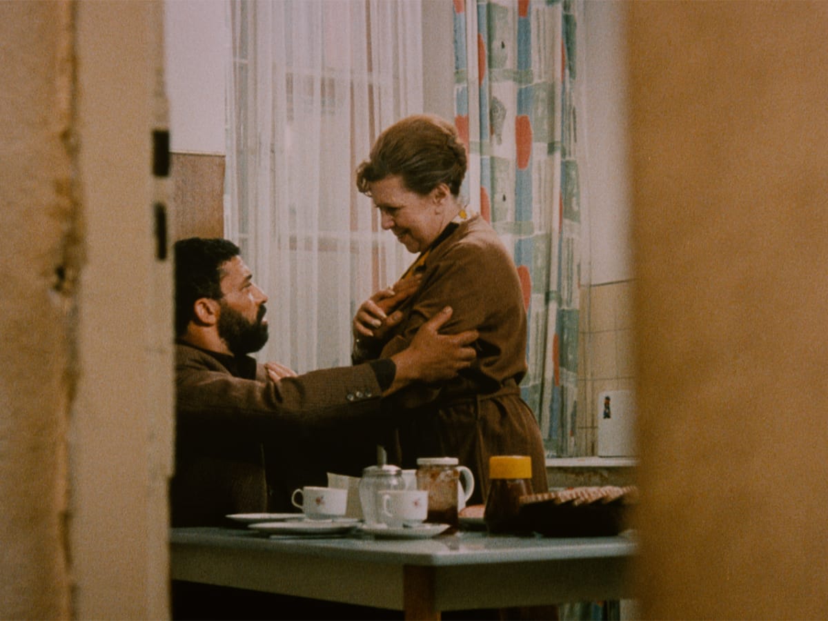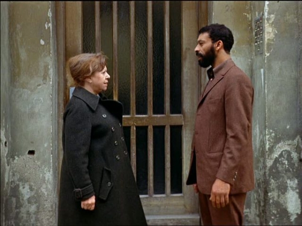 Emmi, a 60-year-old widow and cleaning woman, (Brigitte Mira) dreams of eating at “Hitler’s favorite restaurant.” She enters a bar where the unusual sound of Arabic music piques her curiosity. A weathered Teutonic blonde barmaid (Katharina Herberg) contemptuously serves Emmi a soft drink. Ali (El Hedi ben Salem), a thirty-something Moroccan auto mechanic, takes up a challenge from his fellow barflys to dance with this interloper to their enclave. Fassbinder’s peeking camera captures the couple’s formalized introduction as they talk while dancing to a German song on the jukebox. German and Arabic patrons observe the couple with stern judgment; their contempt serves only to incite the budding romance.
