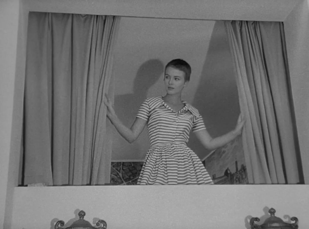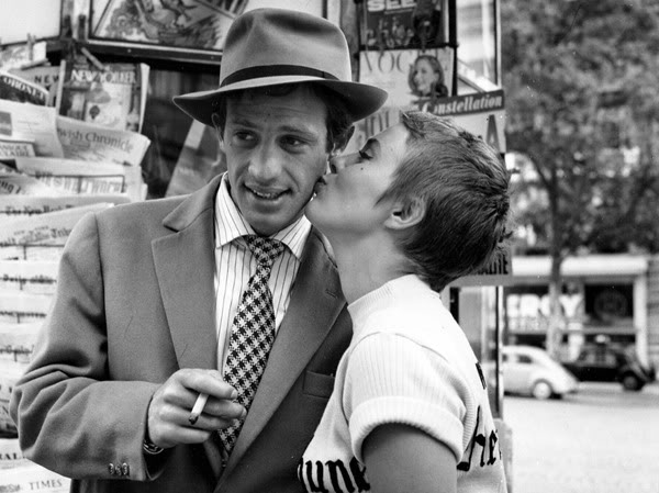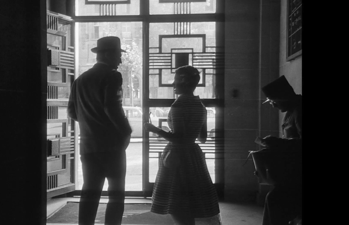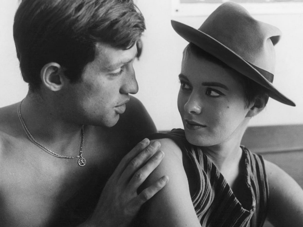 Goddard explores the couple’s budding relationship in a playful centerpiece sequence of flirtation and seduction that plays as innovative today as when it was filmed. Patricia returns to her hotel room to find Marcel sleeping in her bed. Her consciously flat French diction exposes her unwillingness to fully embrace the culture as the couple switch between French and English. They smoke cigarettes that they blithely toss out the room’s open window, glance at magazines, and listen to the radio in a freely expressed mutual seduction that culminates in sex beneath the bed’s sheet.