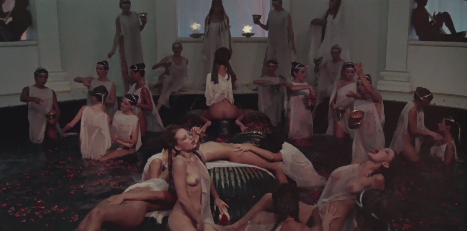 The emperor instructs Caligula while a bevy of satyrs and nymphs carry on various sexual acts around them. Tiberius’s “speaking” statues fornicate and masturbate continuously. The filmmakers present a formal interpretation of Grand Guignol sexuality across a three-tiered stage. Giant gold phalluses adorn the area where sexual performers frolic. Some are deformed. Witness the man with four legs, another with two faces and three eyes.