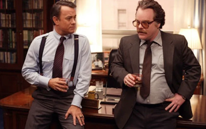 There’s barely a reversal or character arc to be had as the boozing and womanizing Charlie (Tom Hanks) aligns his golly-gee-we’ve-got-to-do-something politics with rich Texas socialite-bible-thumper Joanne Herring (Julia Roberts). Philip Seymour Hoffman steals the movie with an outrageous introduction scene as CIA career loose cannon Gust Avrakotos.
