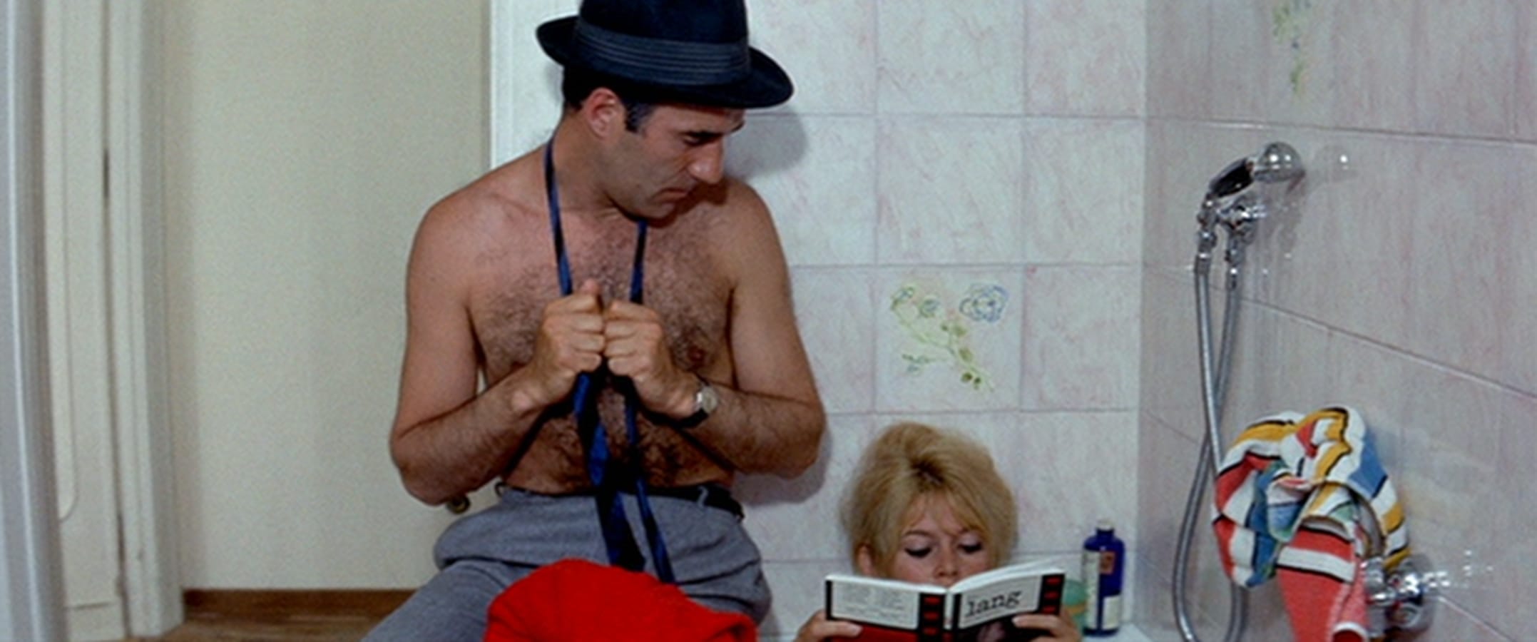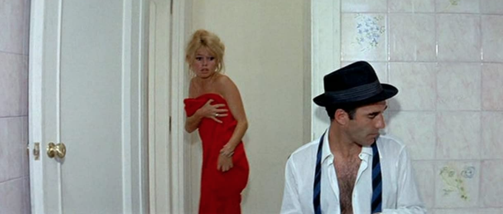 Although she was 29 when the film was made, the younger-looking Bardot is the naked embodiment of girlish femininity and immaturity. The tempestuous Camille baits and torments Paul to the point that he lashes out at her with slaps across her face. The extended middle section of the film takes place in a sparsely appointed but spacious apartment in Rome, which Paul has recently purchased for the couple to share. Contemporary furniture provides a flattering stage for Bardot’s mutable character to cavort between her natural blonde hair and a brunette-wigged disguise that references Goddard’s wife Anna Karina, to whom he was tethered in a rocky marriage at the time.