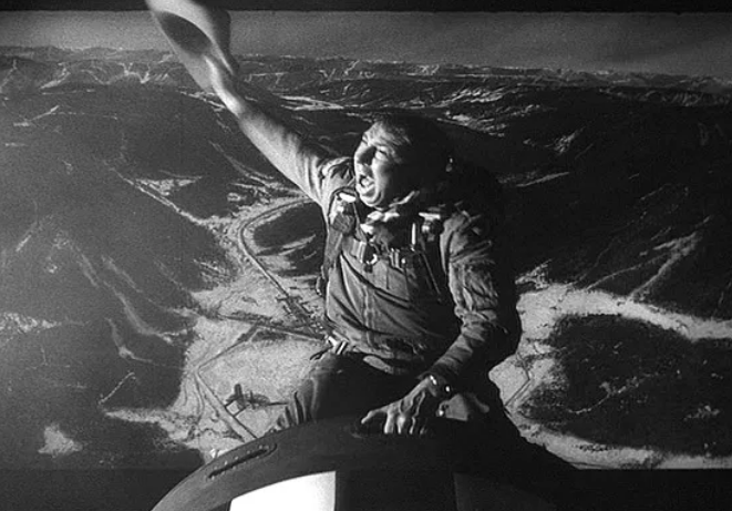 Major T.J. “King” Kong (Slim Pickens) pilots one of America’s constantly circling B-52 bombers in the airspace adjacent to Russia. Kubrick’s intentionally artificial rendering of the model plane flying over a snow-covered Russia adds to the film’s tongue-in-cheek attitude. It takes a few minutes for the cowboy-styled Major Kong to become convinced of the veracity of General Ripper’s impossibly grave order. He dutifully locks in the mission with a bombastic display of idiotic patriotism, promising promotions and medals to all of his crew. Kong might have a slow fuse, but once lit it burns brighter and hotter until the end.
