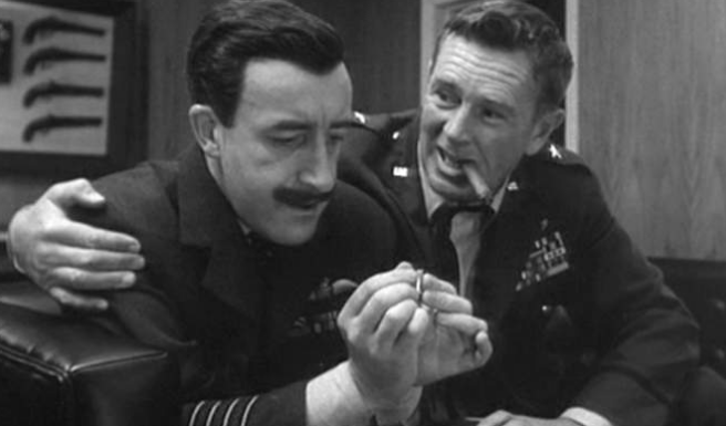 “Dr. Strangelove” pokes fun at the idea of “mutually assured annihilation” and the dubious concept of “nuclear deterrents.” President Muffley’s telephone conversation with Russian premier Dimitri is hilarious for the fey tone Sellers uses to alert the distraught politician of his country’s imminent destruction. Insanity is bipartisan; Russia’s own doomsday device ensures that there will be no survivors in spite of German military strategist Dr. Strangelove’s (Sellers) improvised plan to stock bomb shelters with a ten-to-one ratio of women to men.
