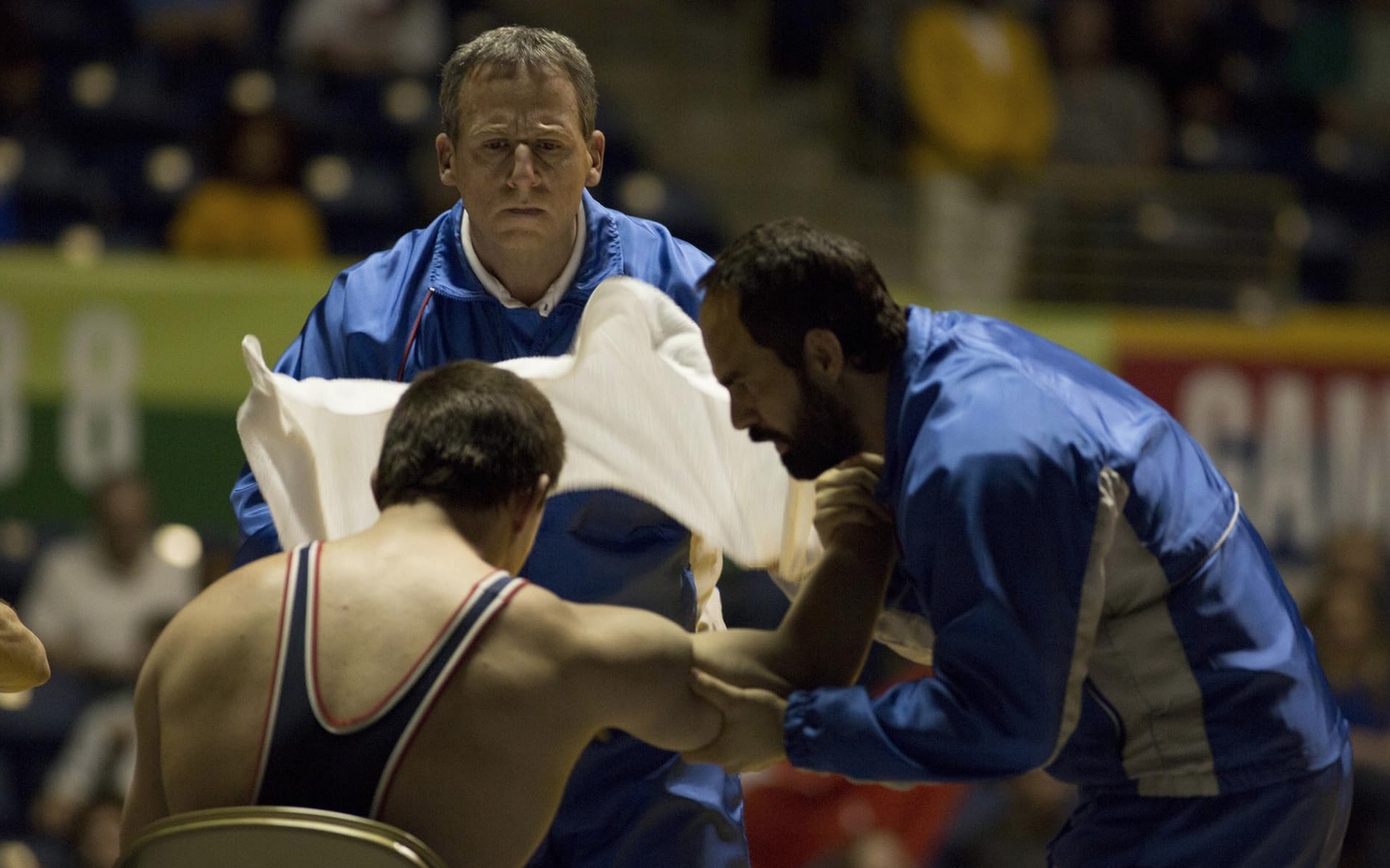 A dialogue-free scene observes Olympic wrestling brothers Mark and David Schultz engaged in their daily physical activity of mano y mano wrestling practice in a dingy gym in an economically distressed U.S. town. Throughout the sequence, and the whole of the movie, Bennett Miller artfully uses film language to allow the audience to fill in the open spaces of the narrative form he creates. It’s as if the filmmaker leaves room for the viewer to stand inside the story.