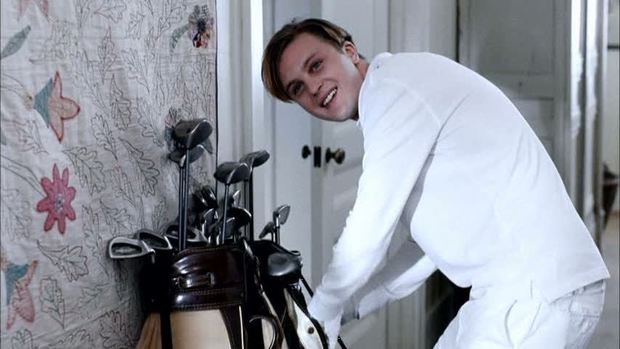 Ann stocks the fridge while George greets a stiffly mannered Fred with his teenaged friend Paul (Michael Pitt) dressed in white shorts, shirt, and gloves — like some kind of germ-fearing tennis player.