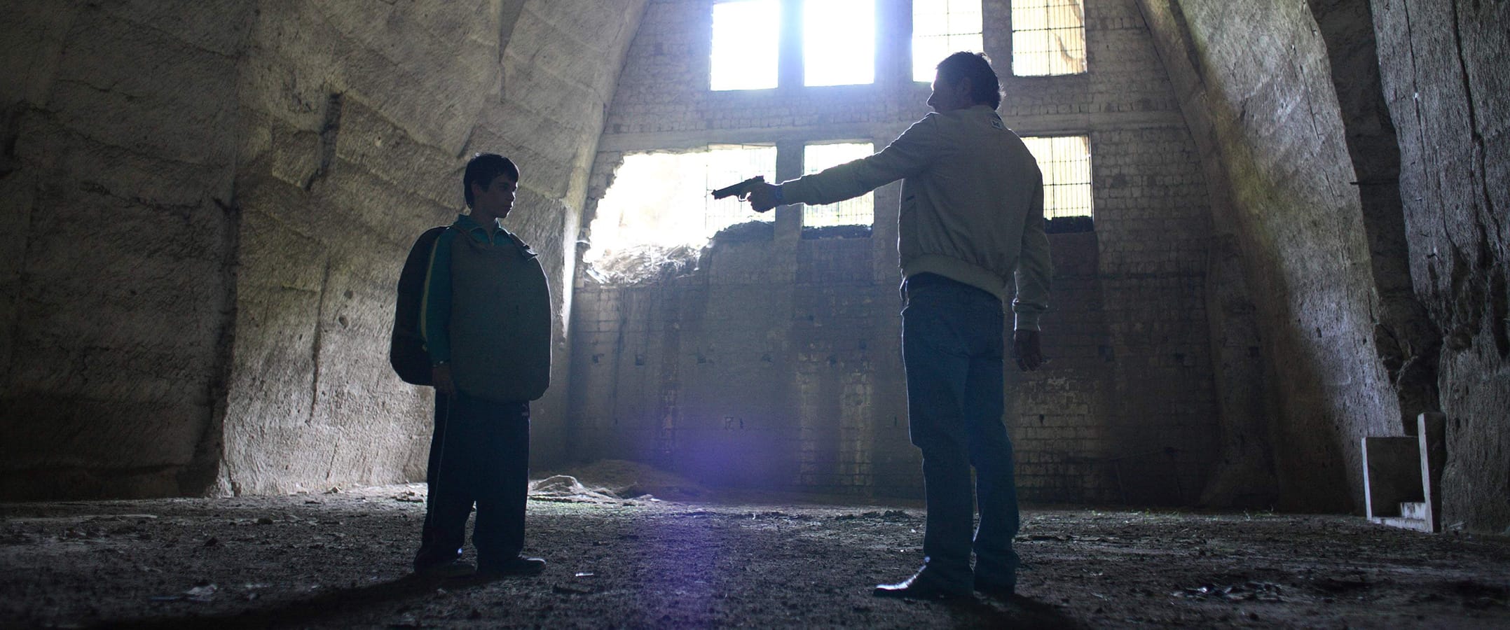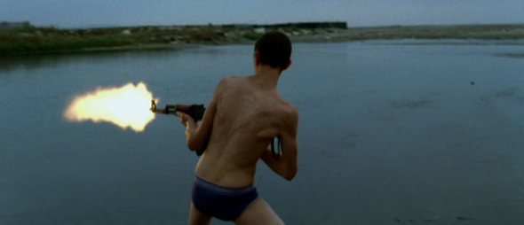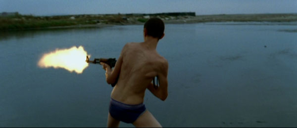 The duo’s discovery of a Camorra arms stash gives way to one of the film’s most indelible sequences in which the boys indulge in some impromptu assault rifle target practice, dressed only in tennis shoes and underwear, along the squalid muddy shore of a river that runs through town.