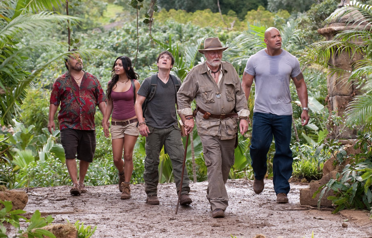 The missive sends Sean off on a chaperoned adventure to reunite with gramps. A sputtering chartered helicopter, flown by Luis Guzman and his character’s comely daughter Kailani (Vanessa Hudgens), enables a suspense-free hurricane ride that spits our plucky explorers out on the shores of an island that could just be the lost city of Atlantis.