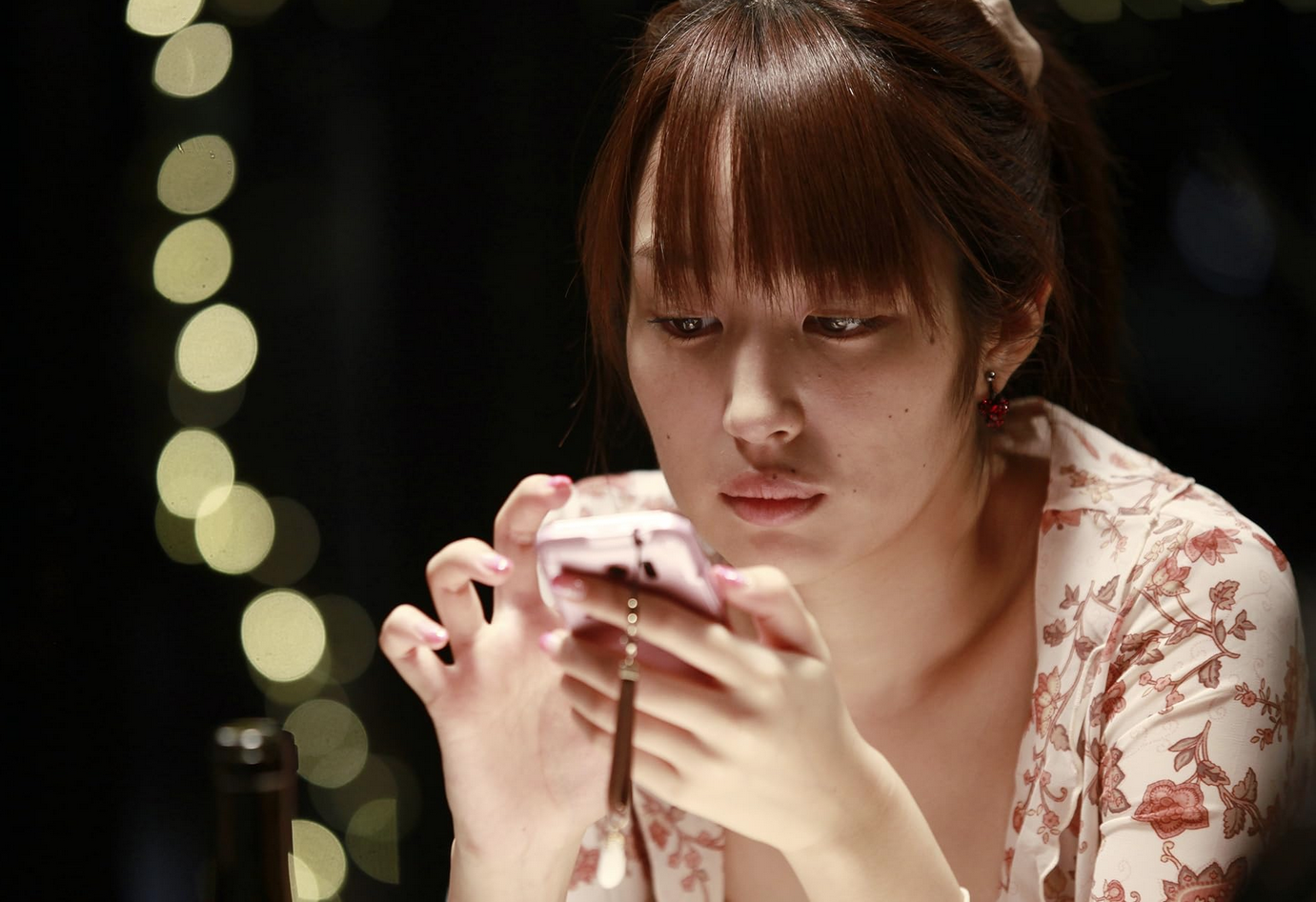 Exposition seeps out. Like Japan itself, a land of cramped and crowded spaces, the social setting is excruciatingly public. “No phones in the toilets,” her boss informs Akiko when she attempts to take her cellphone conversation with her to the bathroom. She fights on the phone with a boyfriend who “only causes her pain.” Her concerned boss advises her to “end it with the boy.” Unlike an average stereotyped pimp, he cares about Akiko as a person, perhaps as much as a family member. The pimp-whore relationship has a father-daughter quality.