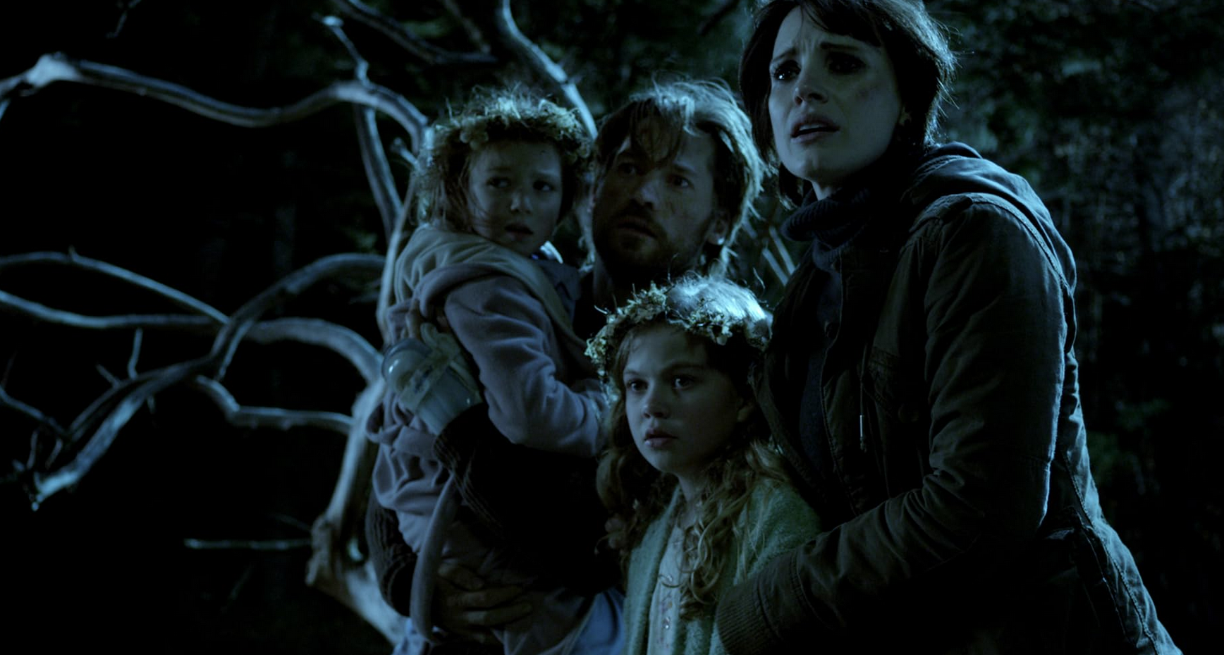 Still able to walk, daddy carries his youngest girl Lilly (Isabelle Nelisse) deep into the woods. His older daughter Victoria (Megan Charpentier) follows them into a disused cabin where some one or some spooky thing lurks.