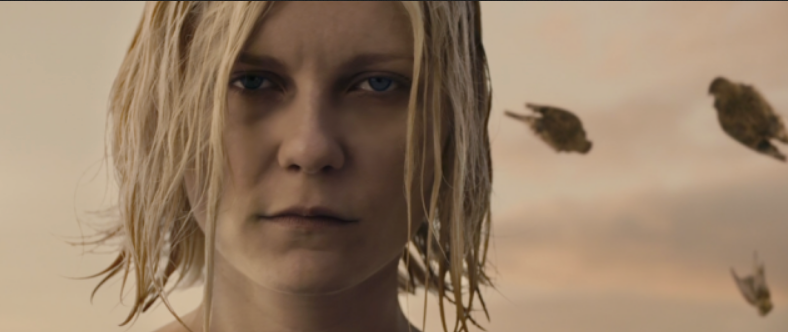 Black birds fall around her like harbingers of a funeral procession. Dunst’s delicate features are filled with stern ambivalence. As she reveals through her actions during the night of her wedding party, Justine’s atheism has prepared her better than believers to live out the final hours of human existence with a composure calculated to allow for whatever choices she might make. Telling off her demanding boss, and cheating on her doting husband (Alexander Skarsgård) of just a few hours, are obligatory actions.