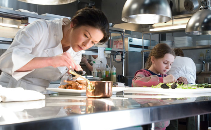 Confrontations with guests at the restaurant, over things like the rareness of a piece of beef, have caused the owner to hire Nick, as an assistant chef to augment Kate’s less-than-cheerful kitchen. The humorous grist of the movie comes from Kate and Nick’s interaction as polar yet complimenting opposites. Watching Nick’s perfectly obeisant behavior toward Kate chip away her brittle exterior is gratifying for the gentle way he also introduces food that Zoe will eat into the equation. Nick plays opera on his boombox in the kitchen, and his singing invigorates the kitchen staff as much as it irritates the head chef. These are three likable characters that deserve a better quality of communication, and the drama springs from their impatient personalities that conspire to flee at any given moment.