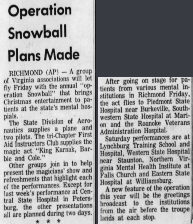 Under the auspices of Operation Snowball, “King Karnak, Barbie, and Cole” would become a ten-year annual touring magic show across the state of Virginia. The purpose of the act was to provide Christmastime entertainment for the patients at all, or most, of the mental institutions in Virginia; there were a lot mental hospitals in those days. Western State Hospital in Staunton, Virginia was on the list.