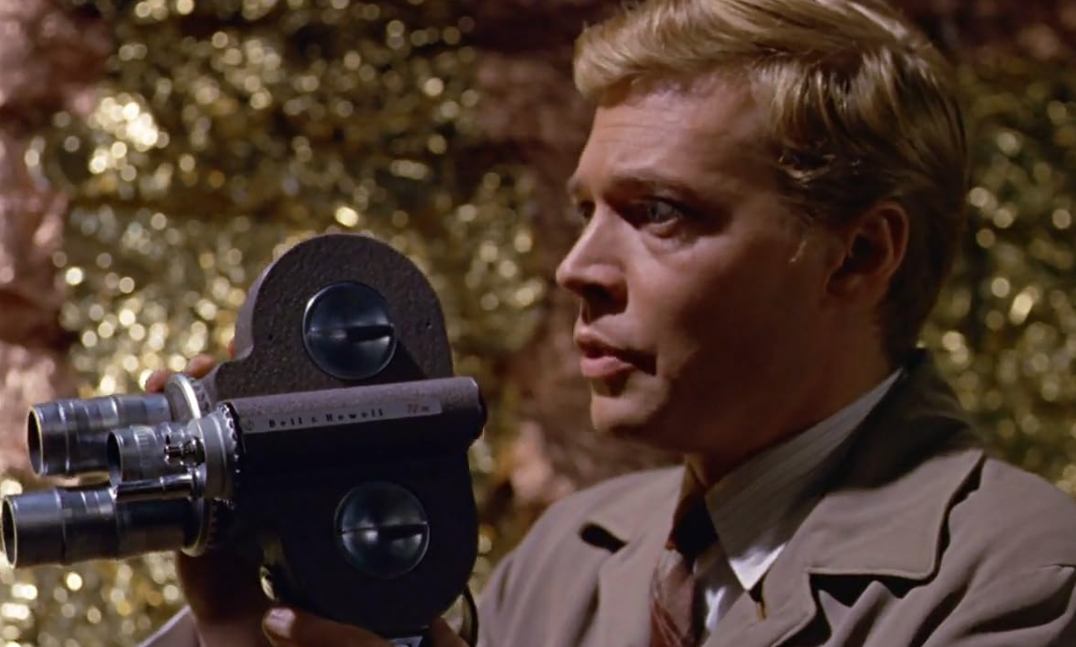 Austrian actor Carl Boehm plays Mark Lewis, a well-dressed blond filmmaker who’s never without his trusty camera. By day Mark works as a focus-puller at a London film studio. By night he works as a pornographic photographer with an eye for the fetishistic. Later at night, Mark indulges in his prized hobby of killing women with a knife-pointed-tripod while filming his victim, who witnesses their own terror at the moment of their death thanks to a mirror that surrounds the camera’s lens.