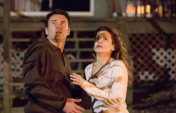 Where many women might faint at such news, Bullock’s Linda remains stoic until she wakes up shocked to find Jim drinking coffee in the kitchen. The surreal episode transforms Linda into an investigator searching every cranny for clues that might enable her to preserve her husband’s life. Prescription pills left in a sink drain, an unfamiliar woman at Jim’s funeral, and a torn phone book point Linda toward a secret that will divulge her own involvement in the disaster.