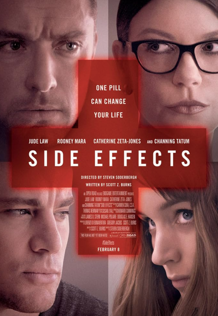 The movie raises ethical questions about how pharmaceutical companies market, test, and sell their wares. The film’s title sets up expectations about undesirable symptoms that can lead to death. But what begins as a diatribe against Big Pharma morphs into a battle of wits between Dr. Banks and his strangely motivated patient.