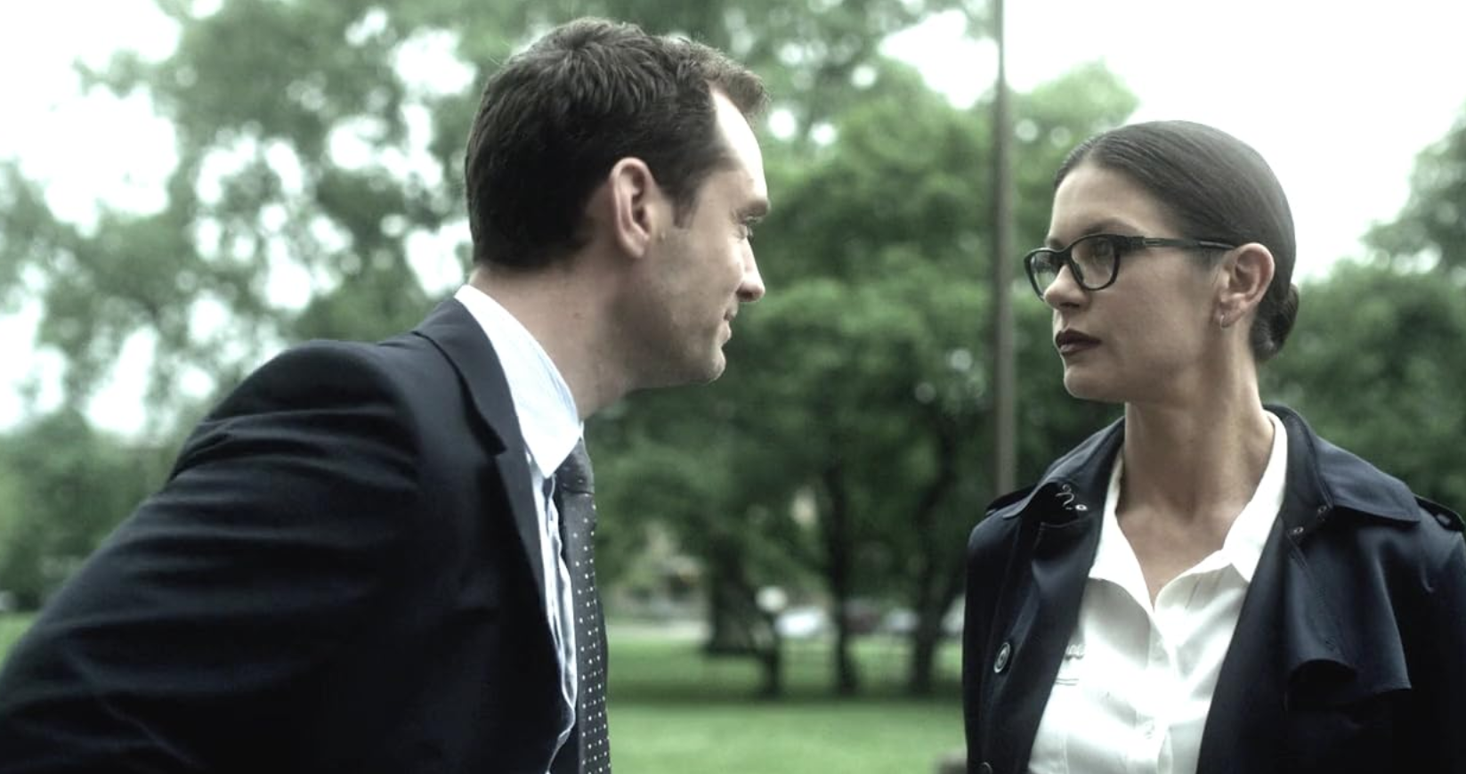 Here is a film that plays two thematic sides against the middle. Caught in a spiraling depression, Emily is a victim of her own mind. She is desperate and unpredictable. Her family-man doctor is caught up in his own struggle to stay above water financially by taking on more patients and by whoring himself out participate in high-paying clinical trials for new mind-altering meds with unknown side effects. Both characters are working an imperfect system to benefit their own agendas. Big Pharma’s position as one of the biggest profit-producing models operating under modern capitalism naturally makes it subject to all kinds of blind angles for opportunists of various stripes to make their fortunes. Causalities are of little concern until the media gets involved.