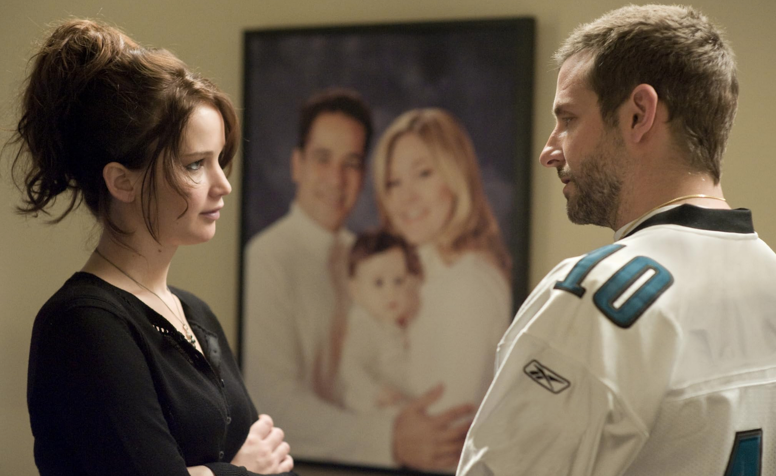 Back at home with his parents Dolores (Jacki Weaver) and Pat Sr. (Robert De Niro), Pat takes up a compulsive reading habit when he isn’t going for long daily running sessions. Pat desperately wants to reconnect with his wife Nikki (Brea Bee). Never mind that she has a restraining order against him. He’s so intent on reinventing his expired marriage that Pat is oblivious to the romantic opportunity that stands in front of him. Pat’s damaged-goods neighbor Tiffany (Jennifer Lawrence) is also a manic-depressive. Like Pat, Tiffany knows her way around every psychotropic drug known to modern medicine.