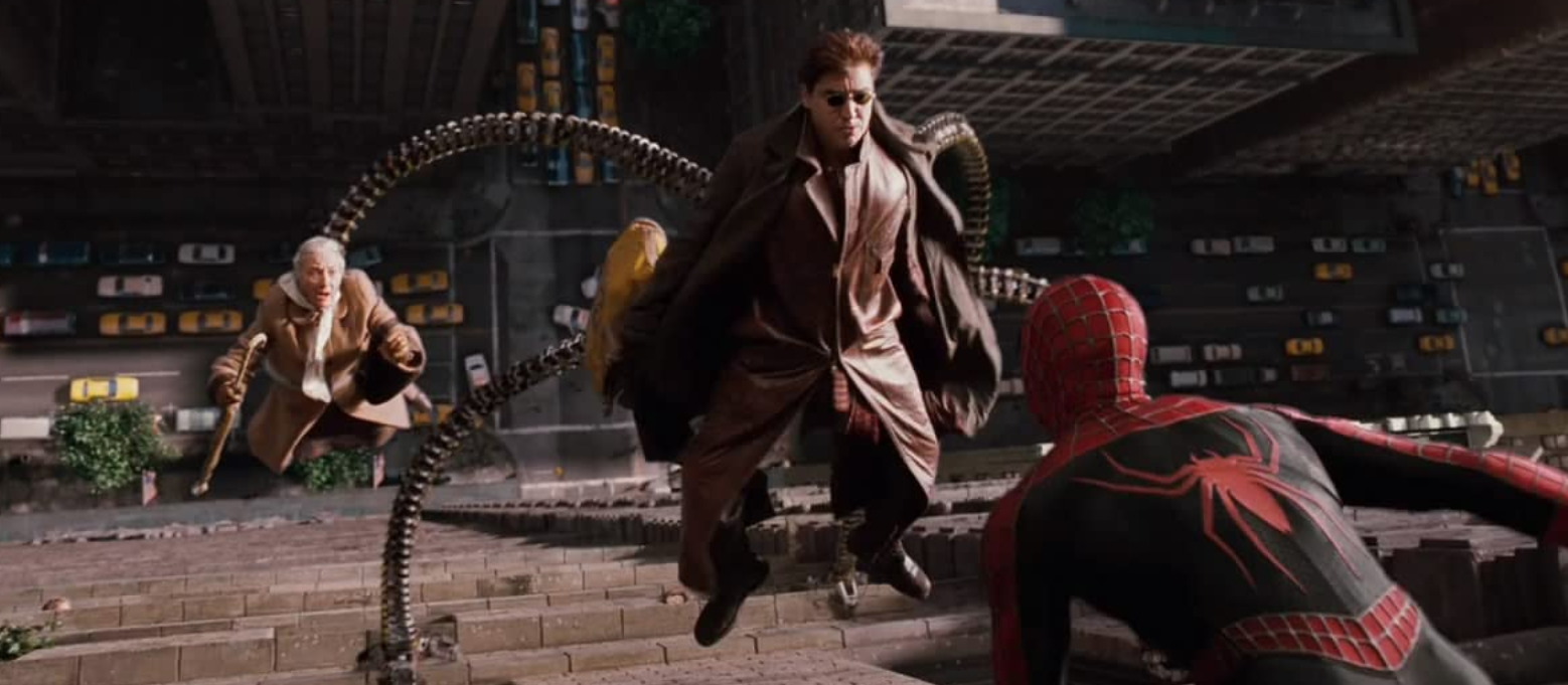Peter Parker and his Aunt May (Rosemary Harris) are interrupted during a visit to a bank for a loan when Doc Ock arrives to rob the place. The ensuing battle finds Aunt May in Doc Ock’s grip atop the tall building with Spider-Man battling gravity as he fearlessly fights the evil doctor to save his cherished aunt. The sequence is remarkable for its guiding elements of humor and pathos amid all of the eye-candy action.