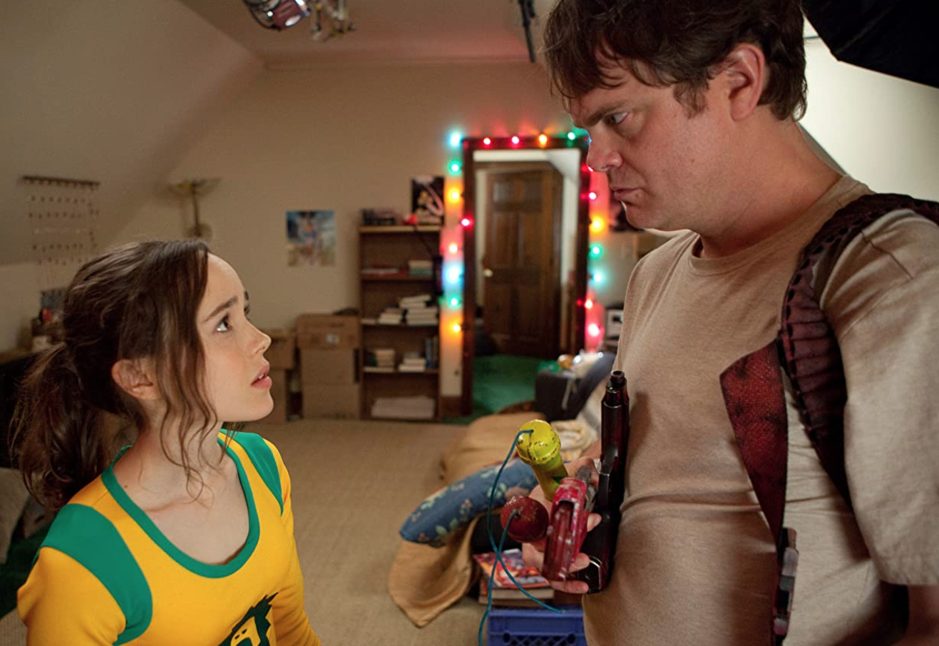 Ellen Page adds her name to the slum list as Libby, a horny comic book store clerk who susses out Frank's secret identity. Libby naturally imposes herself as Frank's short-skirted sidekick "Boltie."