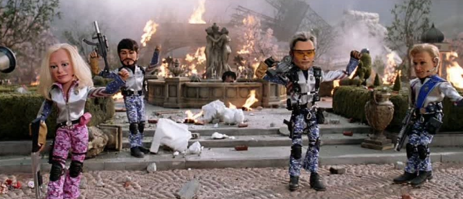 When our puppet commandos kick off “Team America” by killing a group of Muslim terrorists in Paris, they consequently destroy the Louvre killing French civilians like so much inevitable collateral damage. It’s no accident that the French are the first to suffer at the hand of America’s fraternity-minded group of mercenary heroes, complete with ammo belts hung across their chests to preclude any confusion about the heroes’ agenda.