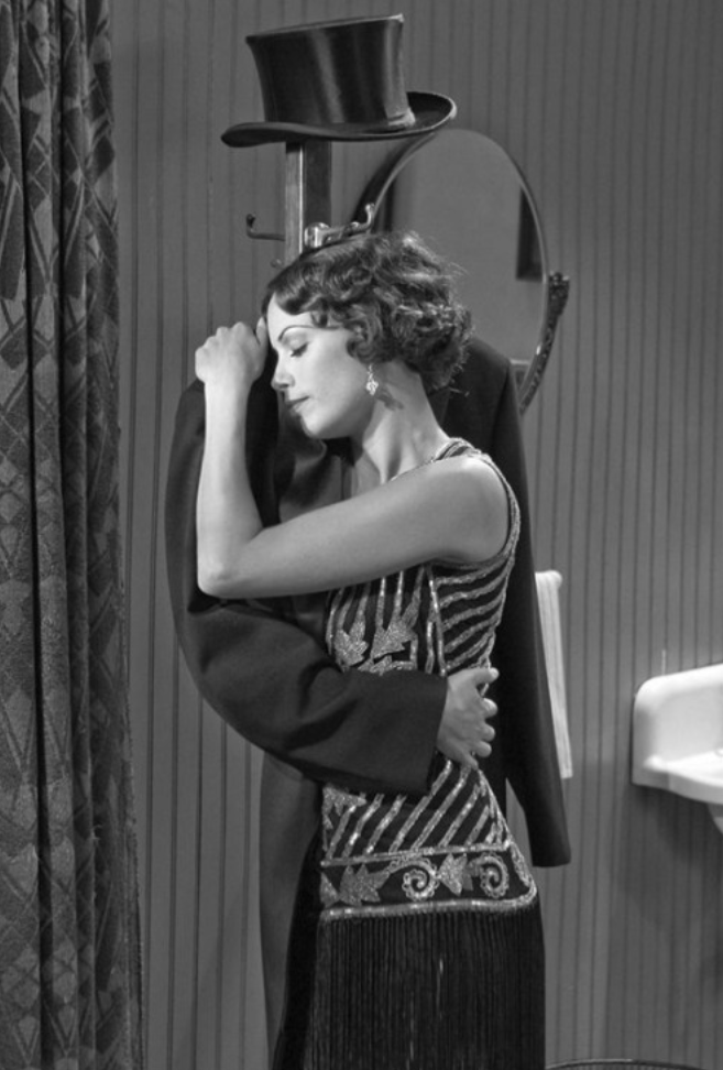 A spontaneous kiss she plants on George’s cheek makes front-page news. With her infectious smile and adorable dance moves Peppy’s silent film career catches fire in the company of the suave and urbane Valentin. Think, “A Star is Born.”