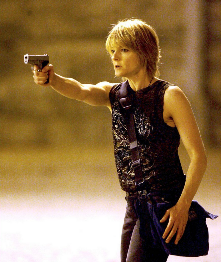 Jodie Foster’s compelling struggle from shattered victim to hard-bitten revenging angel keeps us focused. Her utter commitment to the role is compulsively fascinating. Foster has aged well — her taut lips and feral eyes threaten to eradicate everything in their path. After holing up in her apartment for weeks after being released from the hospital, Erica finally gets up the nerve to venture out and buy a gun that will give her back some level of confidence. At the gun store, her impatience at obtaining a permit alerts a black market firearm dealer to her desperation. She gets a back alley crash course in loading and firing the 9mm. semi-automatic handgun she buys for a thousand bucks.