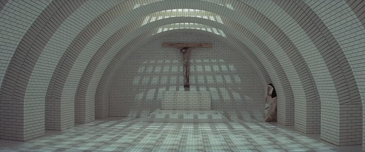 Derek Jarman’s visceral production design is the outrageous work of a mad genius. The entire city of Loudun is made up of sharp white bricks with black mortar. The bold visual effect is chilling. An element of horror infects everything onscreen. Redgrave’s staggering performance as Sister Jeanne prefigures Regan’s demonically possessed character in William Friedkin’s “The Exorcist.” There’s no question that Friedkin drew on “The Devils” for inspiration. Witness Jeanne’s contorted neck-and back-bending performance during her exorcism at the hands of the debauched inquisitor Father Pierre Barre (Michael Gothard).