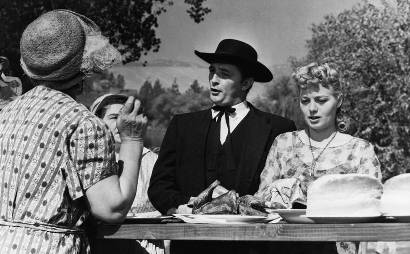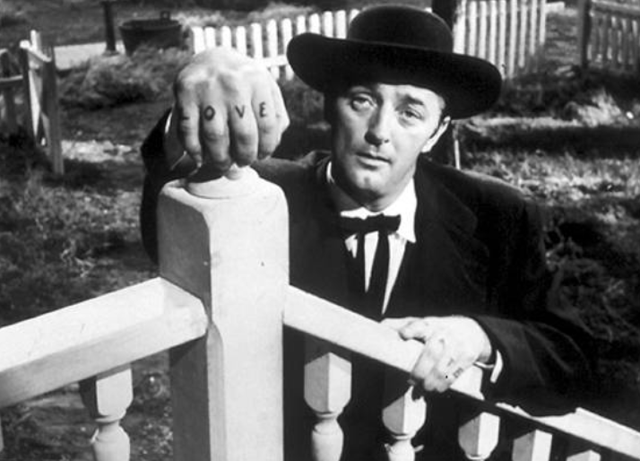 Laughton took an innovative approach toward satirizing America’s Christian belief system and methods of manipulating its society. The setting is West Virginia during the Great Depression. Robert Mitchum plays serial killer Harry Powell. He marries women, kills them and steals their money. Harry dresses as a preacher. He wears a plantation necktie and wide-brim black hat. He peppers his language with biblical phrases. “L-O-V-E” is tattooed on the knuckles of Harry’s right hand.