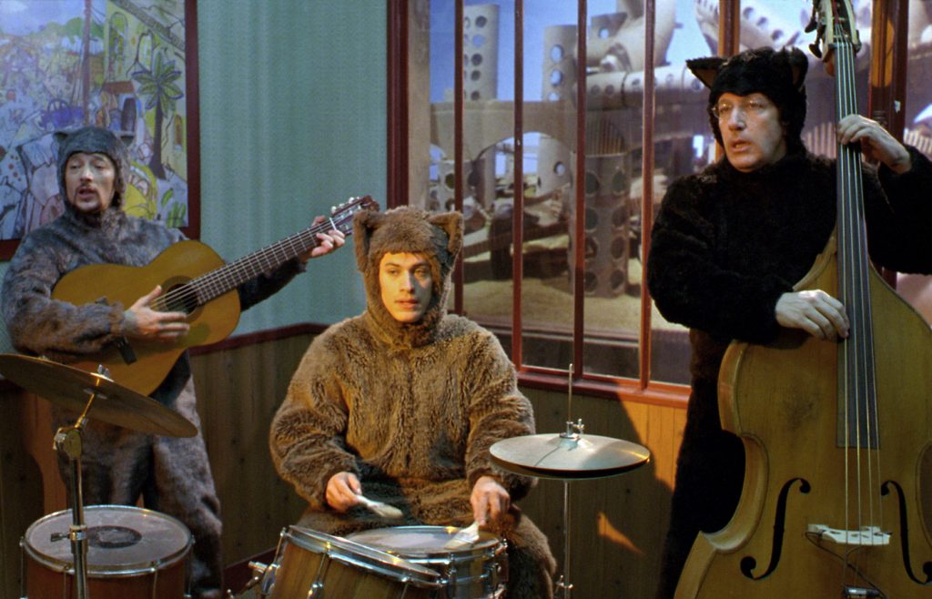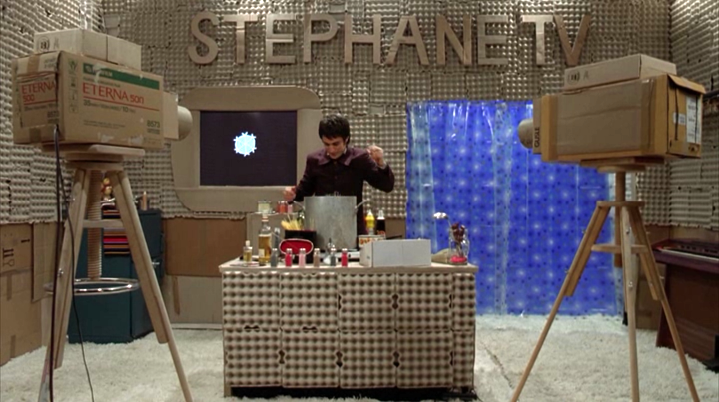 “The Science of Sleep” opens with a reverie sequence where Stephane dreams of hosting a public access brand of one-man TV show from a cardboard set. Stephane jumps around the one-room scenery playing a drum kit one minute before divulging his “recipe for dreams” that includes “events of the day, random thoughts, memories, and songs.”