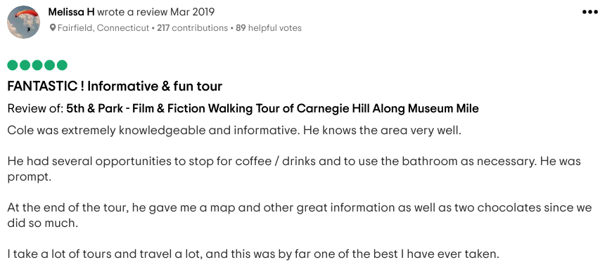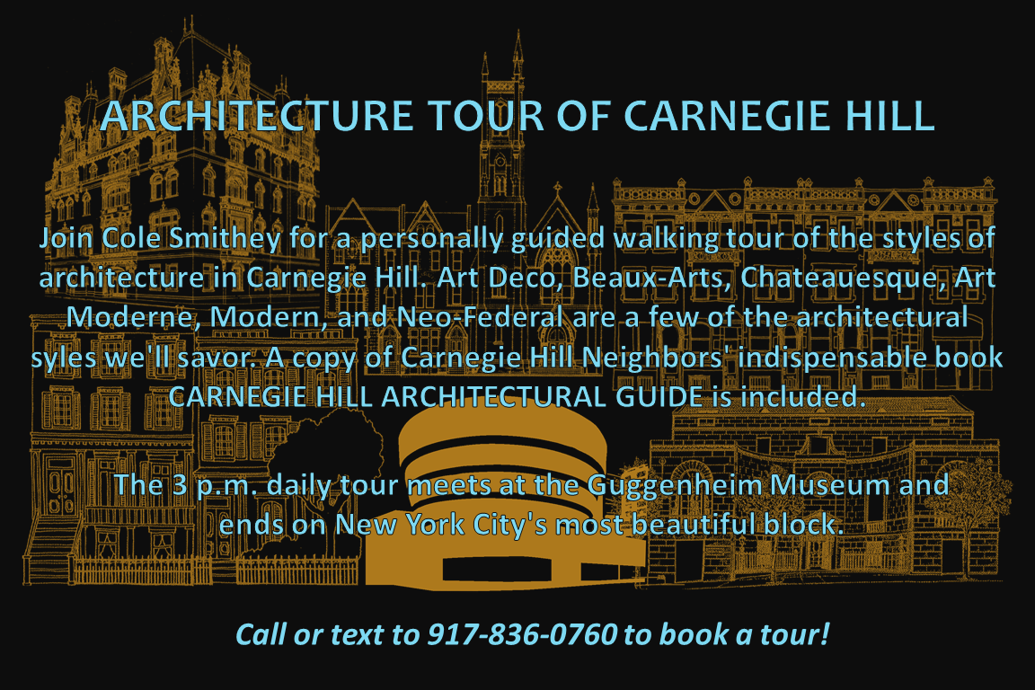 Call or text to 917-836-0760 to book a personalized tour of Carnegie Hill’s 19 different styles of architecture. The tour meets at the Guggenheim, and ends on New York City’s most beautiful block. The tour (price $75) includes a copy of Carnegie Hill Neighbors’