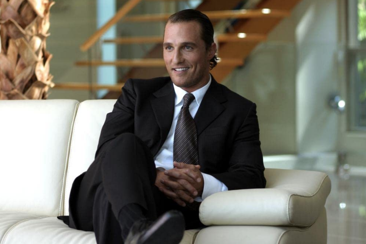 Matthew McConaughey gets to show off his chiseled bod as ex-football star Brandon Lang when Abrams takes him under his wing to transform Brandon into a football pick-em guru called “John Anthony.”