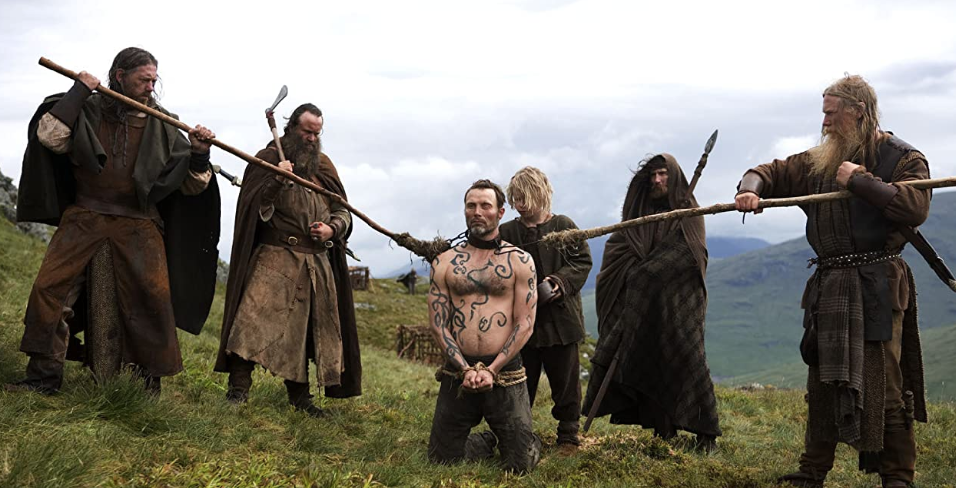 Conceived of as a piece of "mental science fiction," the story opens with the heavily scarred and tattooed slave One-Eye (Mads Mikklesen) tethered by the throat to a wooden post stuck in a muddy hillside. The mute One-Eye kills his opponents with an animal's sense of cold-blooded quickness. The scenes are harrowing for their brutal and gory intensity.