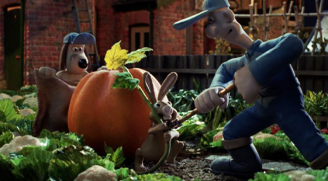 Wallace and Gromit run a brisk pest control business called “Anti-Pesto” by humanely capturing garden-ravaging bunnies with Wallace’s specially invented Bun-Vac 6000 contraption that “sucks as well as blows.” But their Northern England clientele go wiggy when an enormous rabbit attacks their gardens during a harvest full moon to devour every gigantic vegetable in sight. It’s “the world’s first vegetarian horror movie,” but there’s nothing scary about it.